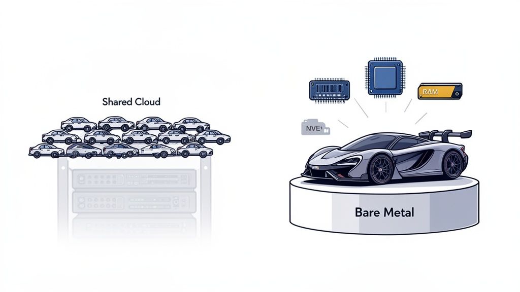 At its core, a bare metal server gets rid of the hypervisor—that software layer that carves up a physical server into smaller virtual machines. That one change gives your applications a direct, unimpeded line to the hardware. They talk straight to the metal, which means you get the absolute lowest latency and the highest possible Input/Output Operations Per Second (IOPS).