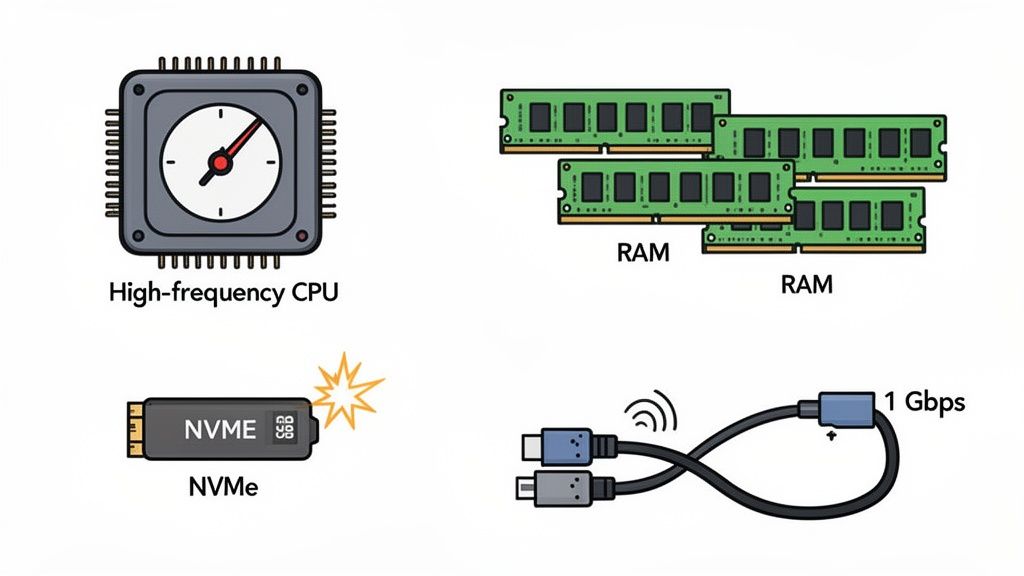 So, you’ve picked your hosting model. Now for the fun part: choosing the engine that will power your game world. The hardware and network you select aren't just line items on an invoice; they're the absolute bedrock of your players' experience. I've seen it a hundred times—lag, painfully slow load times, and poor hit registration can almost always be traced back to underpowered or poorly matched components.