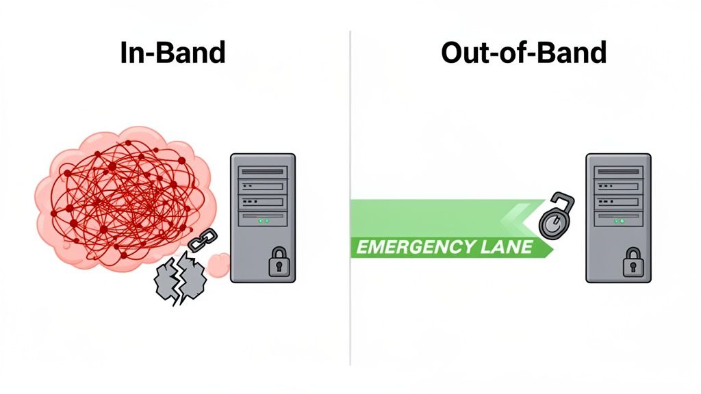 To really get why out-of-band management is so important, it helps to see it side-by-side with its more common cousin, in-band management. The core difference boils down to one simple thing: the network path you use to talk to your gear. While both have their place, they’re built for completely different situations.